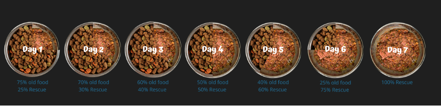Switching your dog to a new diet, especially one designed for sensitive stomachs, should always be a gradual process. Sudden changes in food can shock the digestive system and undo the benefits of a gentle, balanced formula like Volhard’s Rescue Diet. To set your dog up for success, introduce the new food slowly over 7–10 days, mixing a small portion of the Rescue base mix and your chosen protein with your dog’s current food.