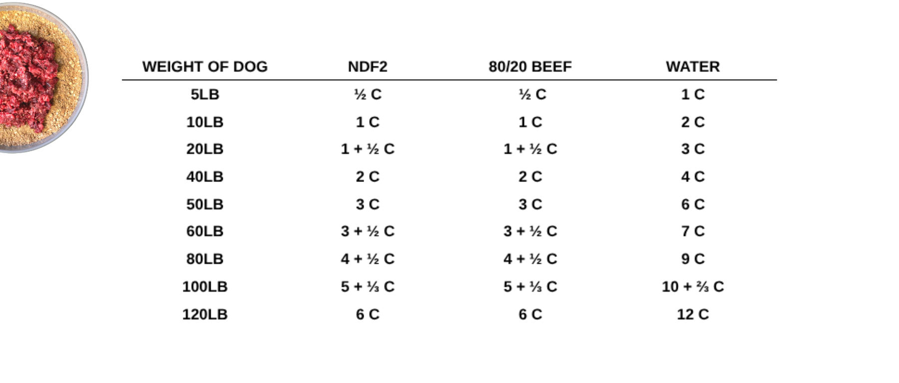Add a small amount of NDF2 and protein to the current diet you are feeding your dog now and mix with water. As the week progresses, gradually increase the amount of NDF2, protein, and water, at the same time decreasing the current diet by a corresponding amount, until you have phased out the current diet. (If you are feeding the same protein for six days, you may want to feed another protein - canned mackerel or cottage cheese - on the seventh day.) At the end of the transition period, weigh your dog. Weigh them again after four weeks. Increase or decrease the amount you feed accordingly.