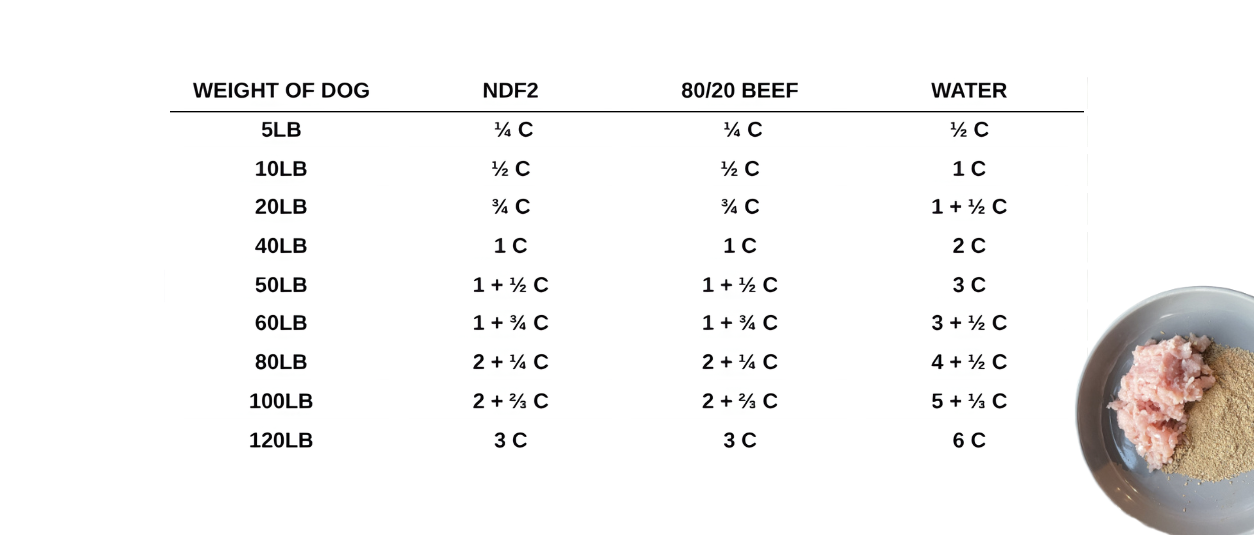 Add a small amount of NDF2 and protein to the current diet you are feeding your dog now and mix with water. As the week progresses, gradually increase the amount of NDF2, protein, and water, at the same time decreasing the current diet by a corresponding amount, until you have phased out the current diet. (If you are feeding the same protein for six days, you may want to feed another protein - canned mackerel or cottage cheese - on the seventh day.) At the end of the transition period, weigh your dog. Weigh them again after four weeks. Increase or decrease the amount you feed accordingly.