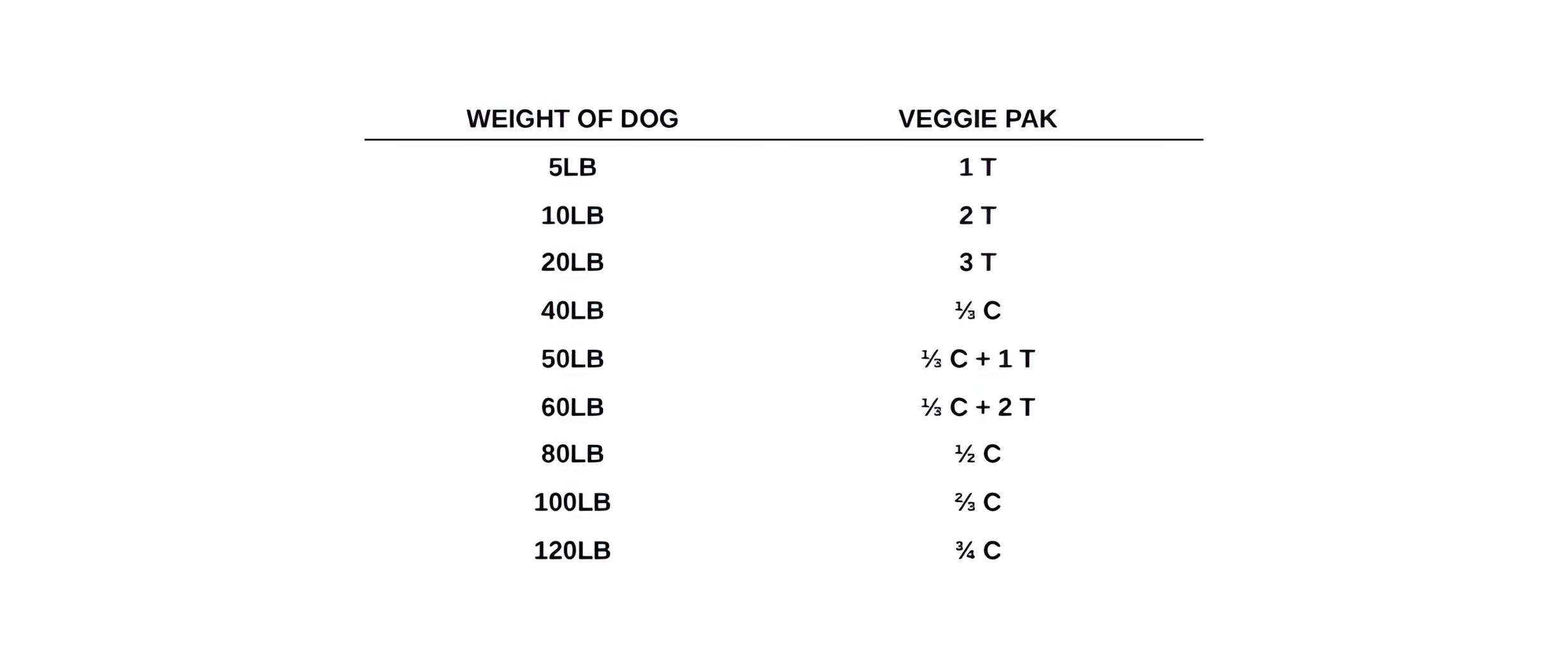1. Sprinkle the amount of Veggie Pak, as directed below, on your dog’s regularly fed food.